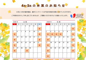 4月・5月の蓮井建設、蓮井コンクリートの休業日は以下の通りになります。